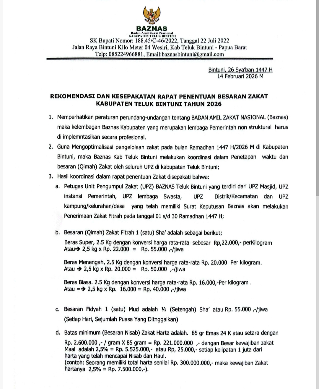 Dalam keputusan tersebut disepakati bahwa penerimaan zakat fitrah oleh UPZ BAZNAS Teluk Bintuni dilaksanakan mulai 1 Ramadan hingga 30 Ramadan 1447 H, sebelum pelaksanaan Salat Idul Fitri. UPZ yang dimaksud meliputi UPZ masjid, instansi pemerintah, lembaga swasta, distrik/kecamatan, serta kampung/kelurahan/desa yang telah memiliki Surat Keputusan BAZNAS.