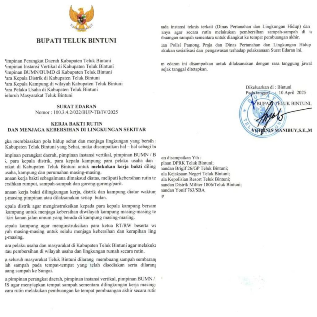 Teluk Bintuni, Indikatornews.co.id – Dalam upaya menciptakan lingkungan yang bersih dan sehat, Bupati Teluk Bintuni, Yohanis Manibuy, mengeluarkan Surat Edaran Nomor 100.3.4.2/022/BUP-TBIV/2025 tentang kerja bakti rutin dan menjaga kebersihan di lingkungan sekitar. Edaran ini ditujukan kepada seluruh jajaran pemerintahan, instansi vertikal, BUMN/BUMD, pelaku usaha, serta masyarakat Kabupaten Teluk Bintuni. Kamis (10/4/2025).