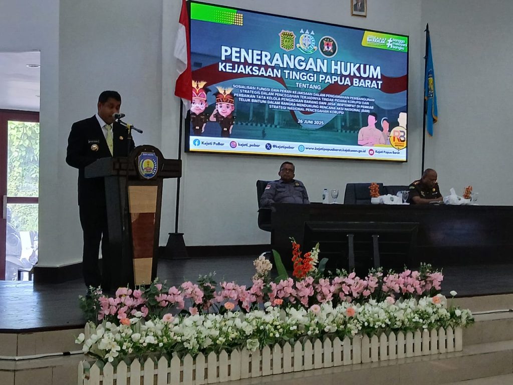 Teluk Bintuni, IndikatorNews.co.id – Kejaksaan Tinggi Papua Barat melalui bidang Intelijen menggelar kegiatan Penerangan Hukum bertajuk “Sosialisasi Fungsi dan Peran Kejaksaan dalam Pengamanan Pembangunan Strategis sebagai Upaya Pencegahan Tindak Pidana Korupsi dan Perbaikan Tata Kelola Pengadaan Barang dan Jasa” di Kabupaten Teluk Bintuni, Kamis (26/6/2025). Kegiatan ini dilaksanakan di Gedung Sasana Karya, Kompleks Kantor Bupati Teluk Bintuni, Distrik Manimeri.