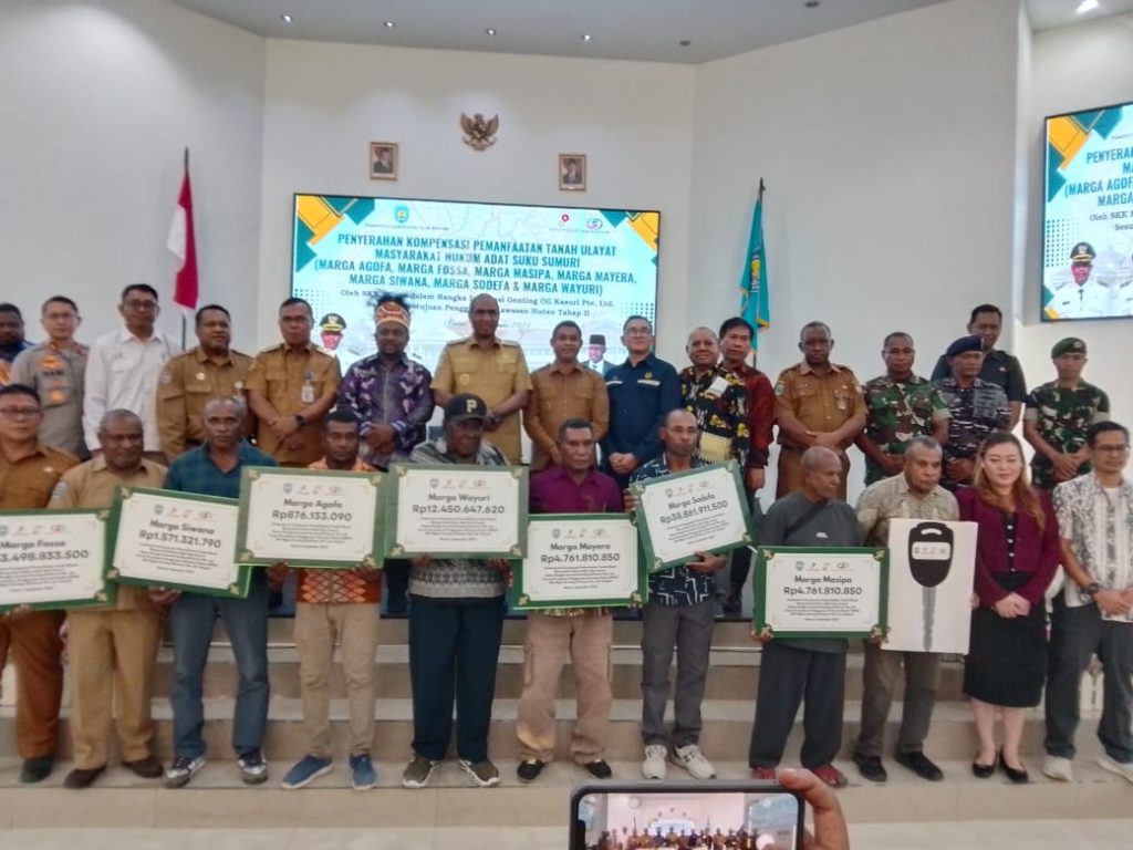 “Pengakuan dan perlindungan hak masyarakat hukum adat telah diatur dalam Peraturan Daerah Nomor 1 Tahun 2019 serta Peraturan Bupati Nomor 15 Tahun 2023. Kami berharap kompensasi ini membawa manfaat nyata bagi kesejahteraan masyarakat Suku Sumuri,” ujar Yohanes.