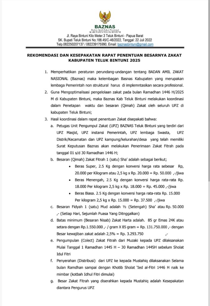 Teluk Bintuni,Indikatornews.co.id– Badan Amil Zakat Nasional (BAZNAS) Kabupaten Teluk Bintuni, bekerja sama dengan Kementerian Agama dan Majelis Ulama Indonesia (MUI) setempat, telah menetapkan besaran zakat fitrah yang wajib ditunaikan oleh umat Islam pada bulan Ramadhan 1446 H/2025 M. Penetapan ini dilakukan melalui musyawarah bersama yang berlangsung di aula Kantor Kementerian Agama Teluk Bintuni belum lama ini. Sabtu (29/3/2025).
